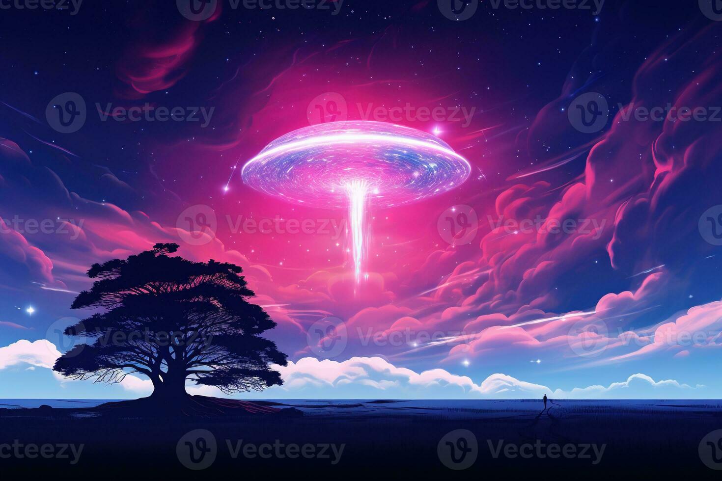 Landscape background tree with a colorful fractal nebula. Generative AI Pro Photo