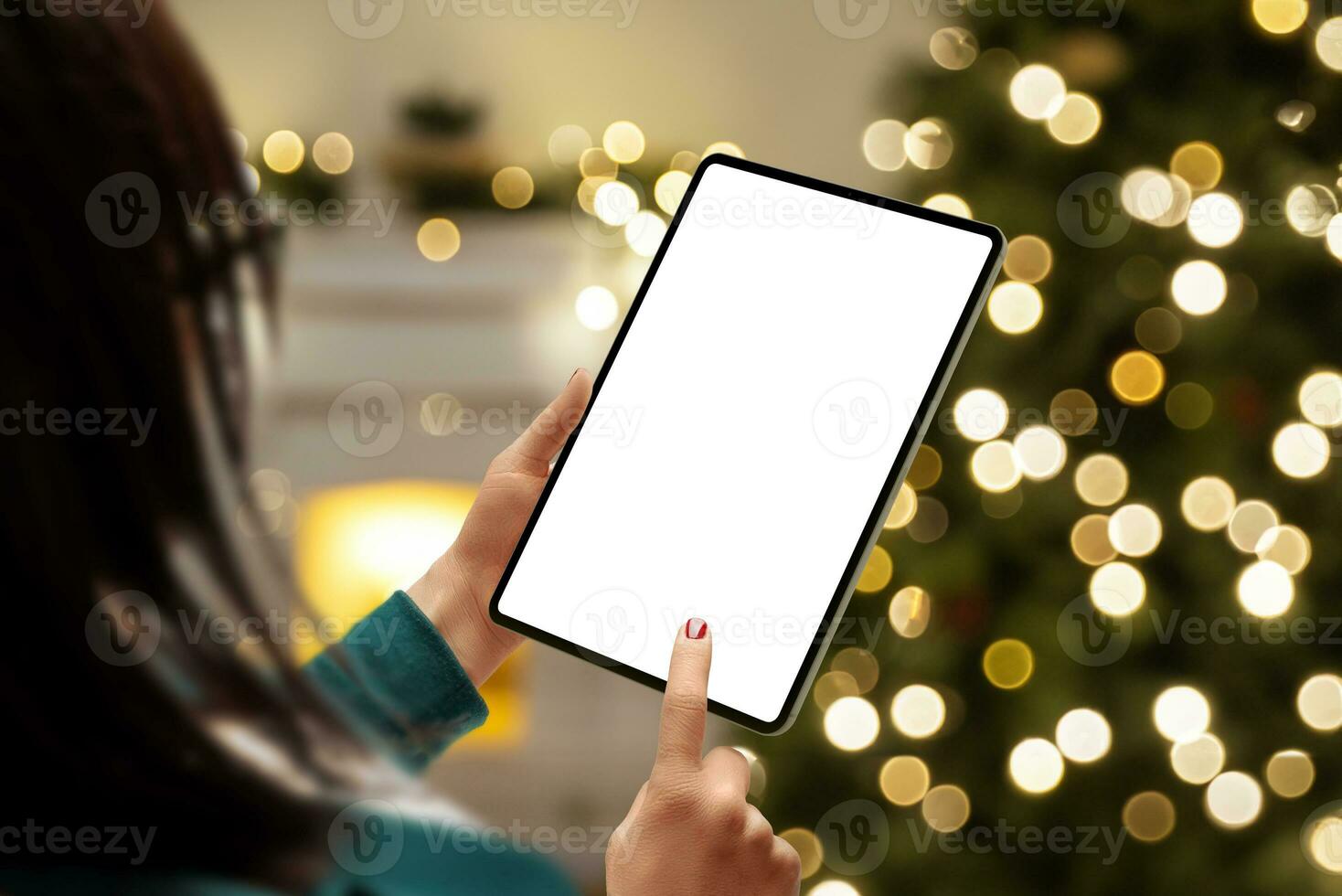 Woman with tablet mockup by a Christmas tree, offering an isolated display screen for app or web page presentation. Ideal for showcasing apps or web designs in a festive setting Pro Photo