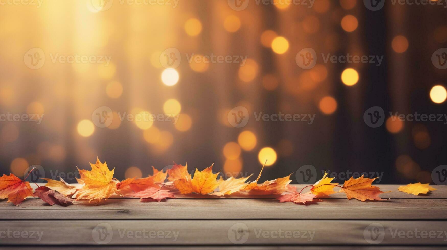 AI Generated autumn maple leaves on wooden plank stand table with glittering bokeh background for Thanksgiving day design concept. Pro Photo
