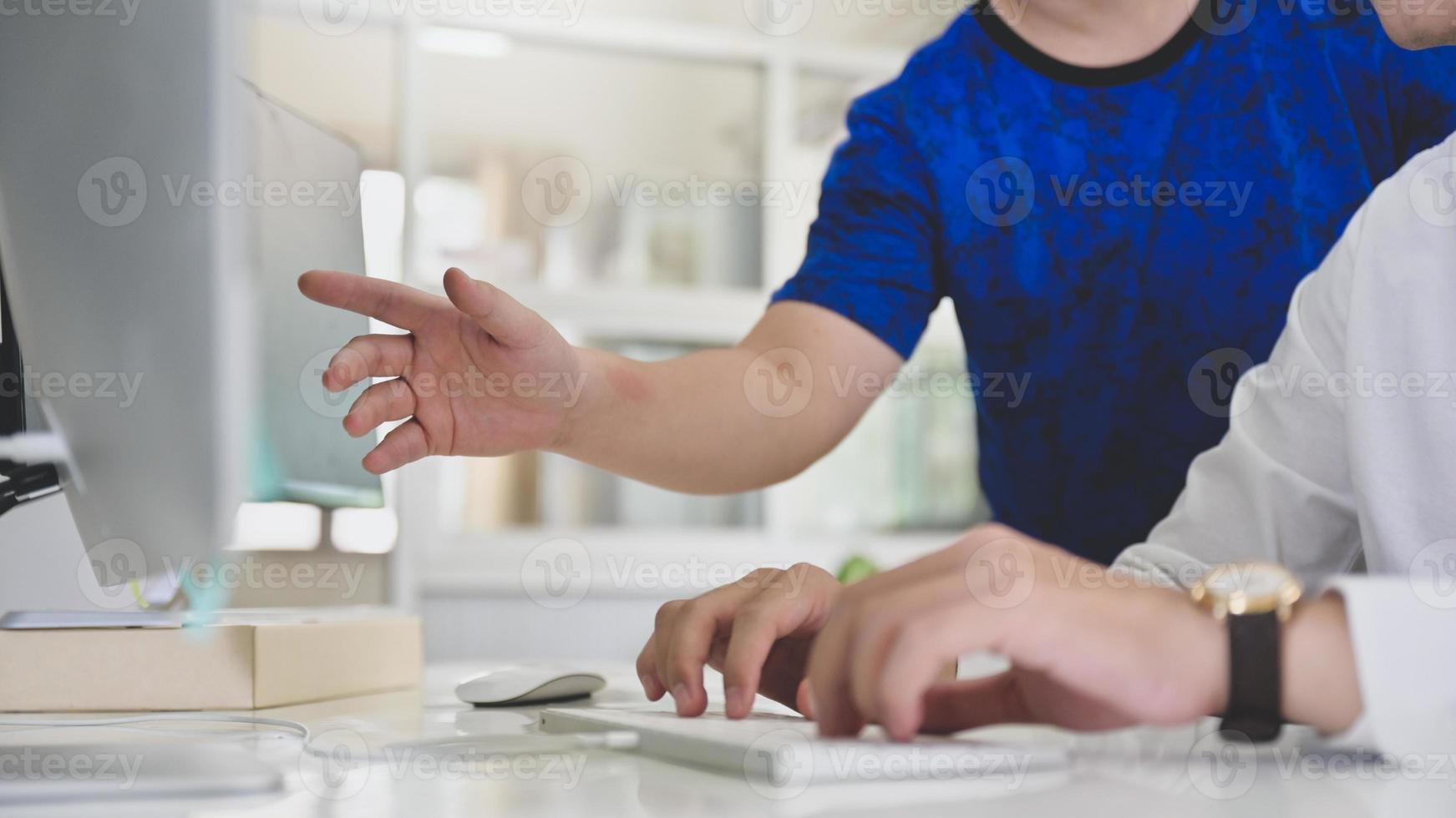 Program analysts pointing at a computer monitor to guide programmers. Pro Photo