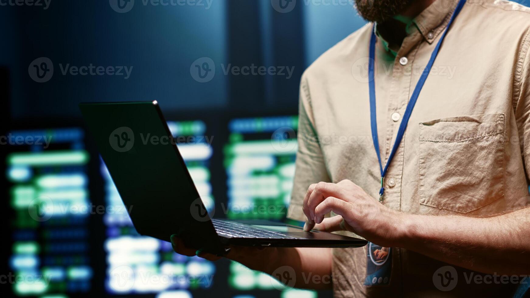 Computer scientist using laptop to check data center security to make sure virus protection software is up to date and hackers trying to penetrate systems are denied, close up Pro Photo