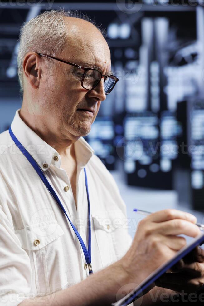Aged computer scientist in crypto mining farm with specialized infrastructure using Blockchain technology. Fintech employee holding clipboard, inspecting asic racks solving complex hashing operations Pro Photo