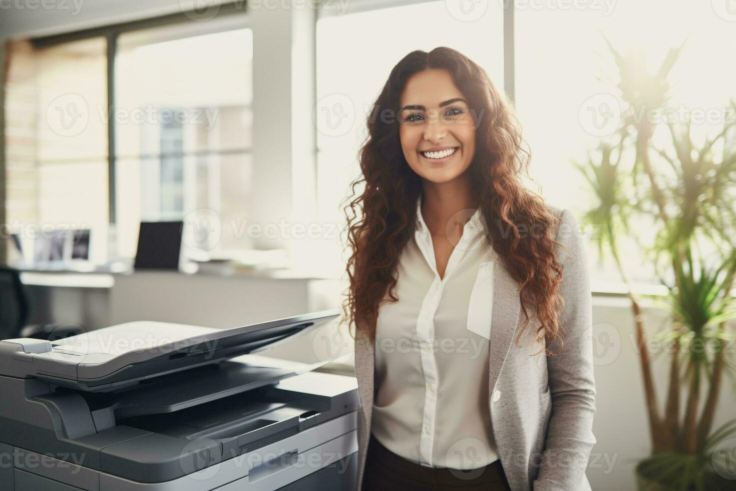 Office worker prints paper on multifunction laser printer. Document and paperwork concept. Secretary work. Smiling woman working in business office. Copy, print, scan, and fax machine. Generative AI. Pro Photo
