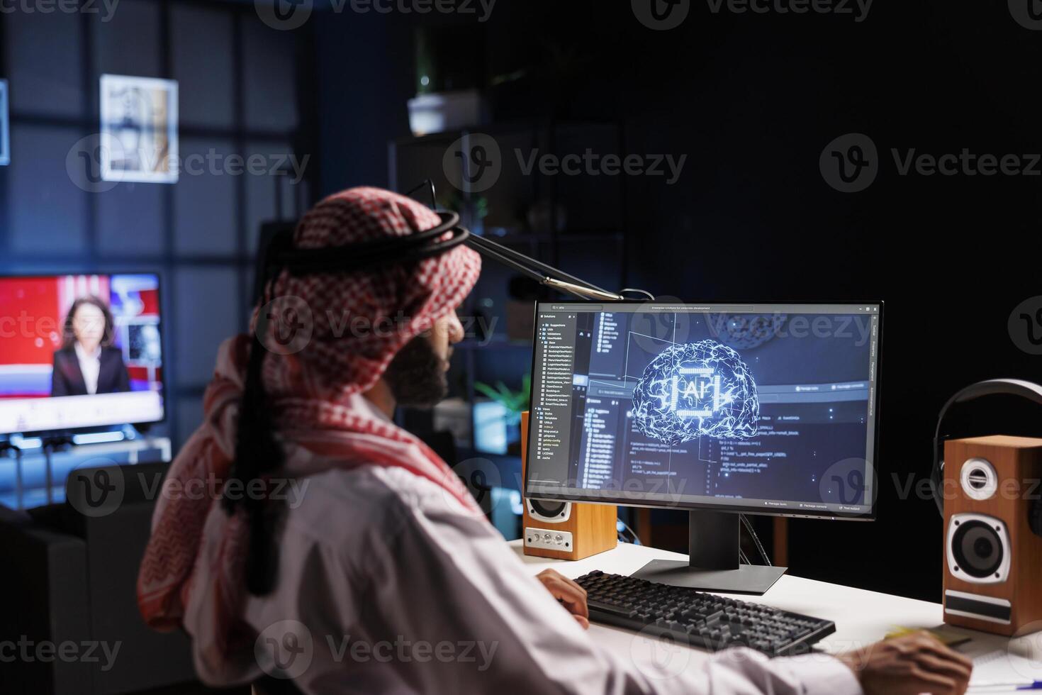 An Arabian engineer examining data and ensuring cybersecurity. With expertise in information technology and programming, he develops software for machine learning and quantum computing. Pro Photo