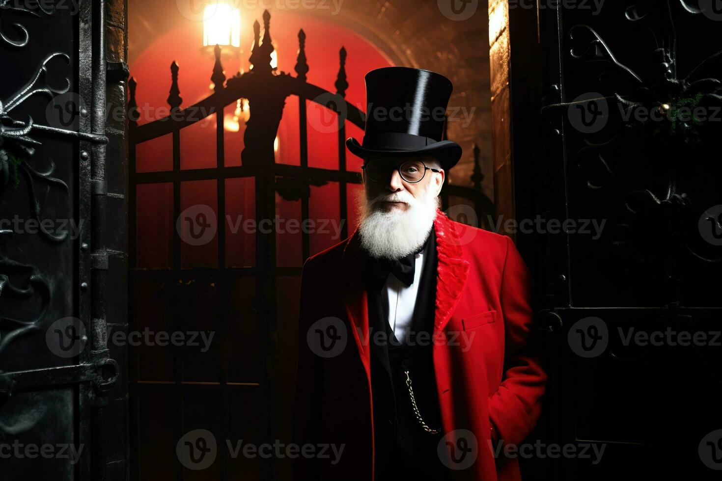 AI generated a man with a white beard and a red coat standing in front of a gate Pro Photo