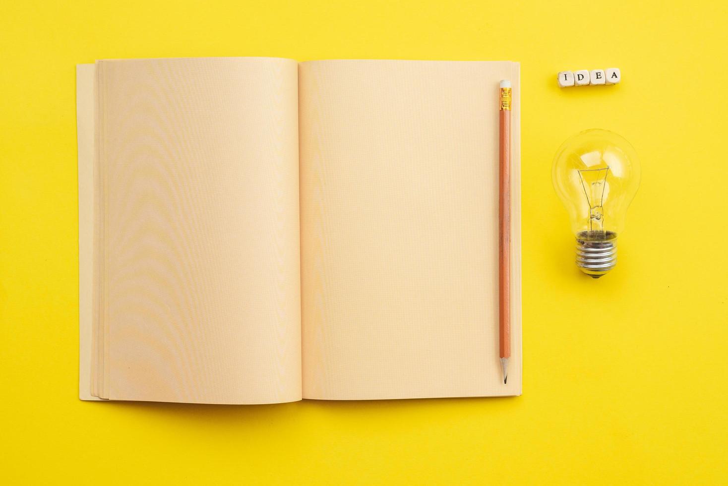 Open empty diary with a pencil and a bulb  and an  inscription idea on yellow background photo
