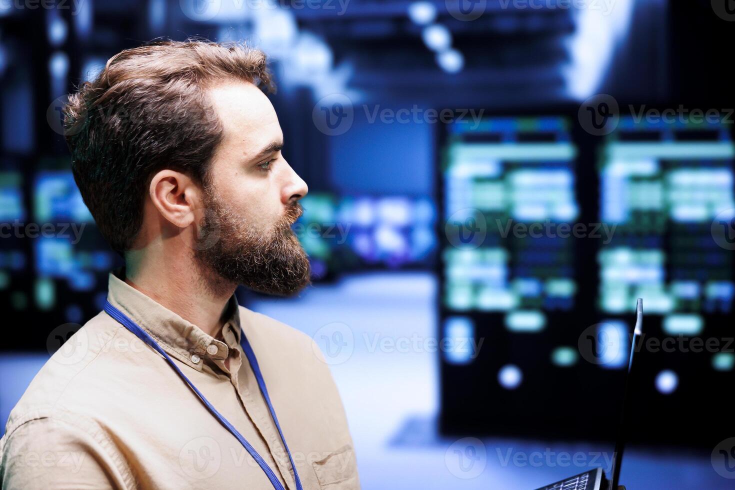 Close up shot of precise engineer doing inspection in blockchain technology application specific integrated circuit server hub. Adept technician working in crypto mining facility Pro Photo