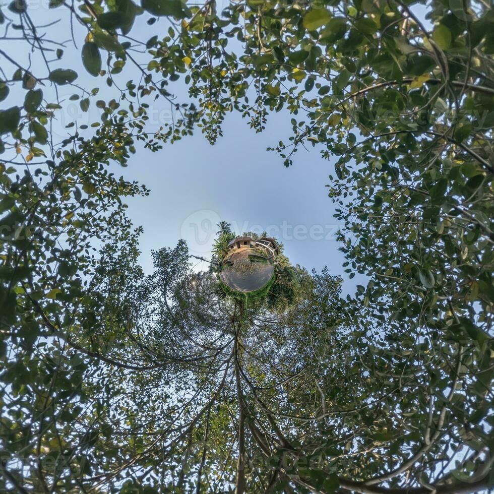 tiny planet transformation of spherical panorama 360 degrees. Spherical abstract aerial view in forest with clumsy branches. Curvature of space. Pro Photo