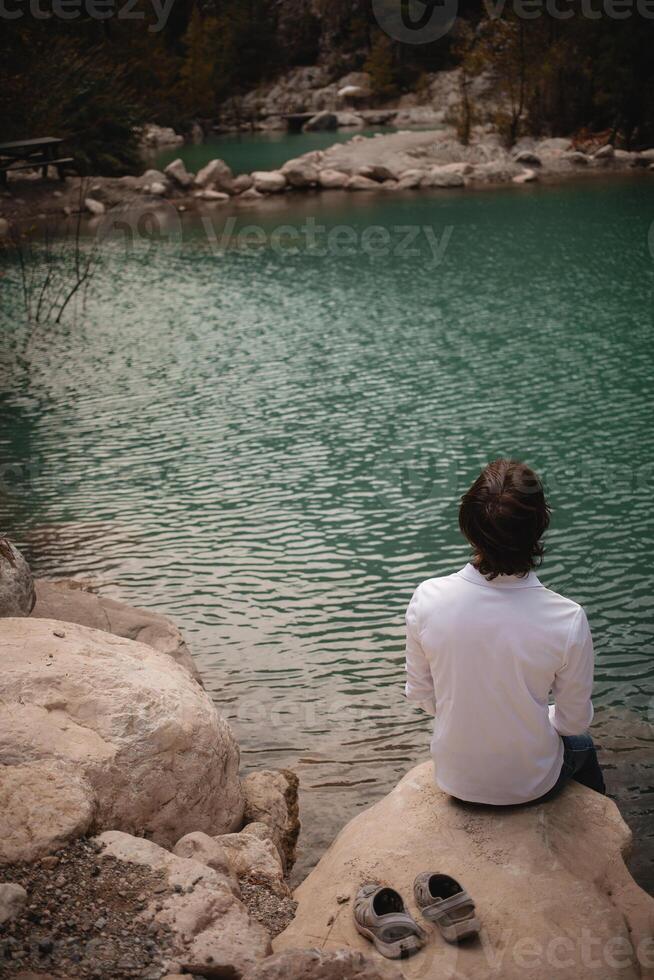 Man on the background of a mountain lake, tranquility and unity with nature in Turkey. authentic Pro Photo