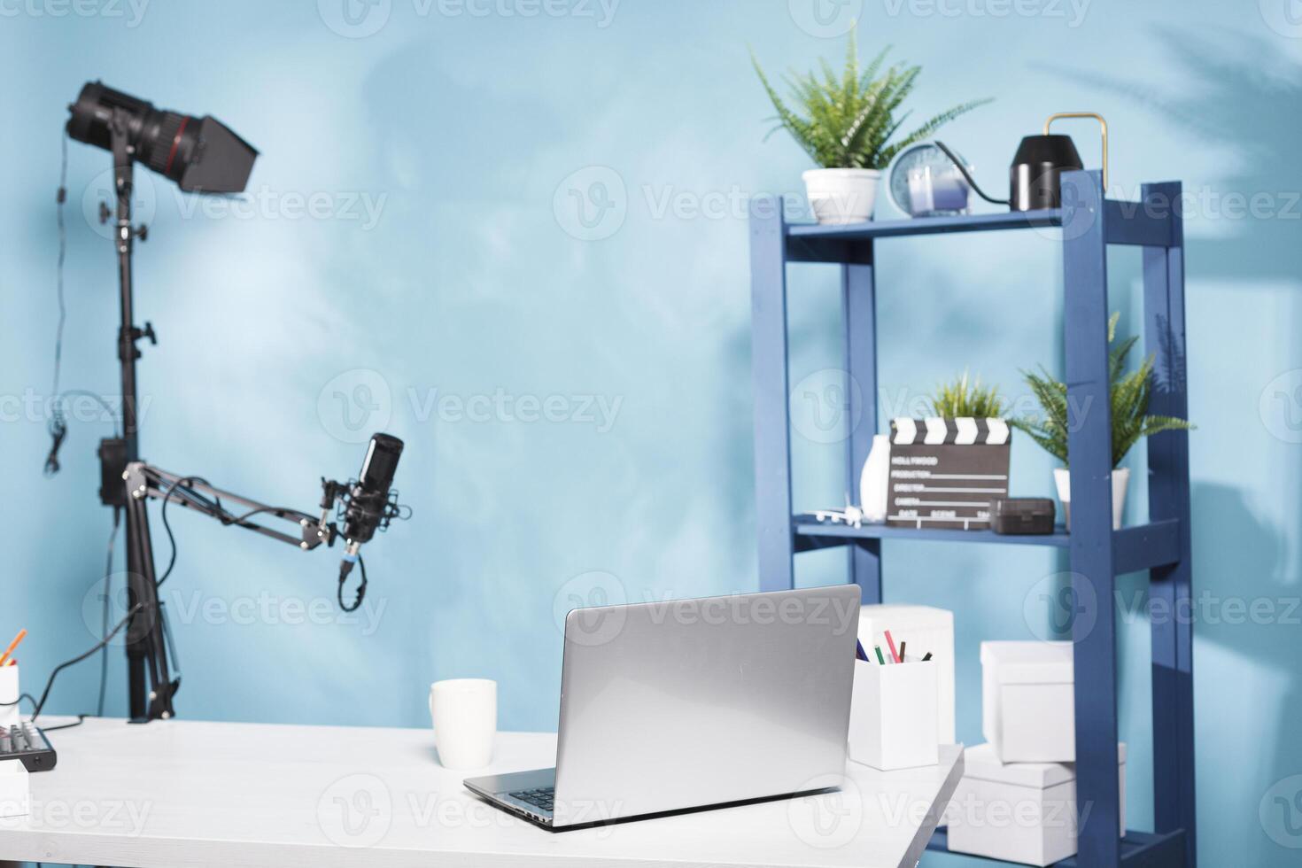Blogger empty workplace with professional equipment and laptop on table ready for live streaming. Portable computer on desk and microphone in vlogger modern home studio with no people Pro Photo