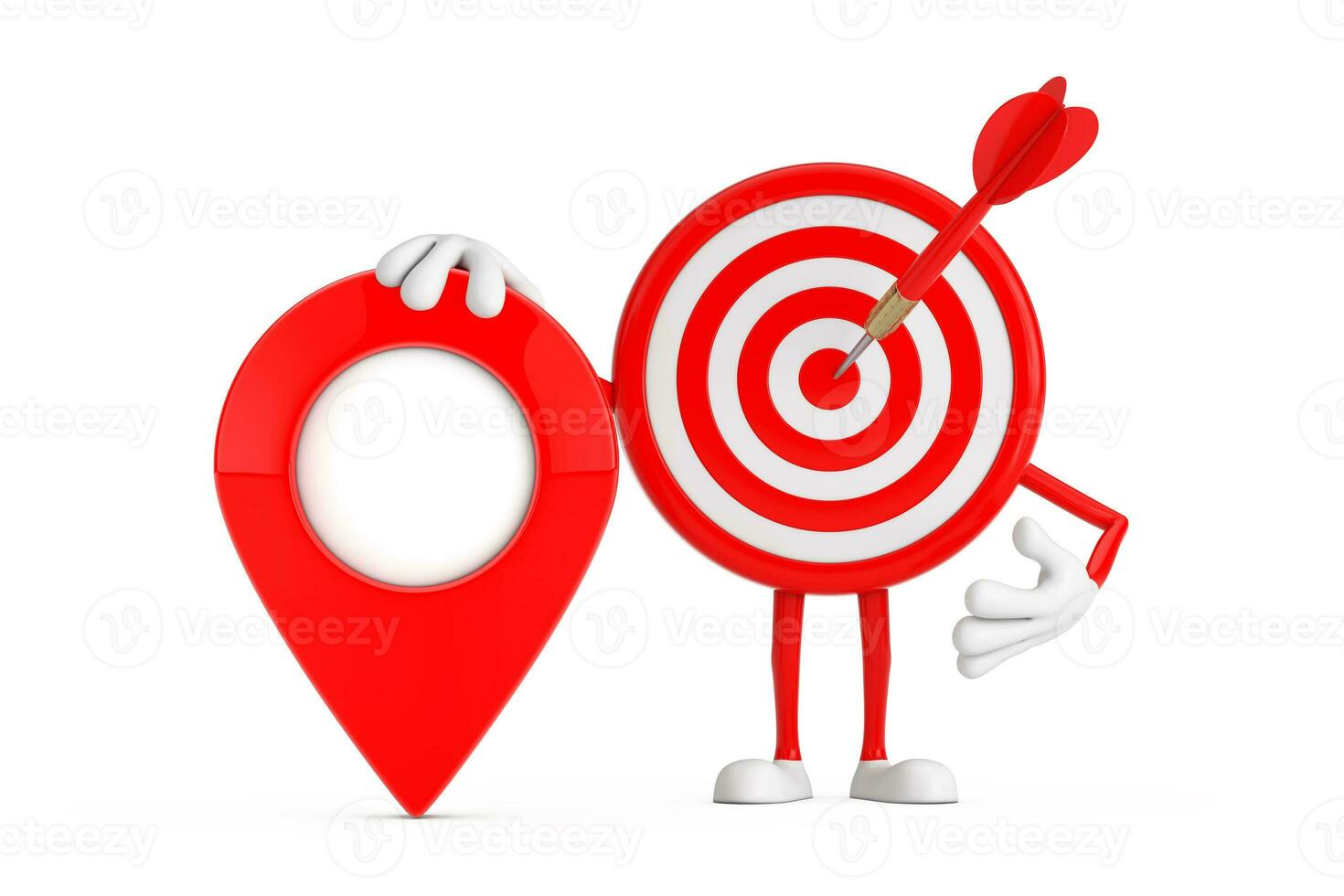 Archery Target and Dart in Center Cartoon Person Character Mascot with Red Target Map Pointer Pin. 3d Rendering Pro Photo