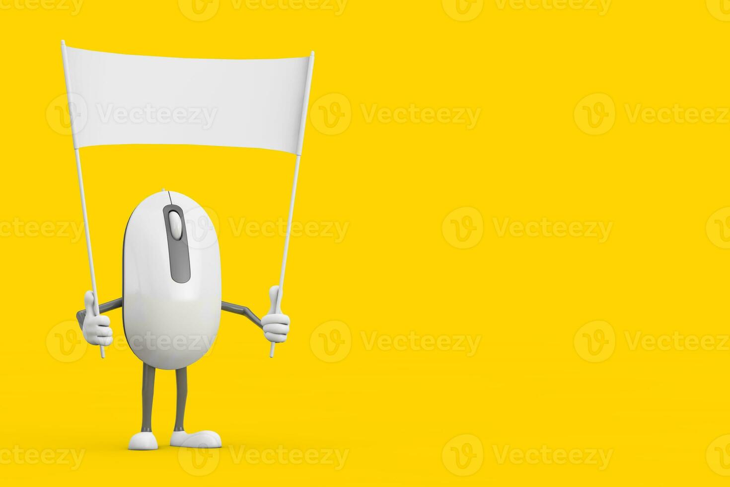 Computer Mouse Cartoon Person Character Mascot and Empty White Blank Banner with Free Space for Your Design. 3d Rendering Pro Photo