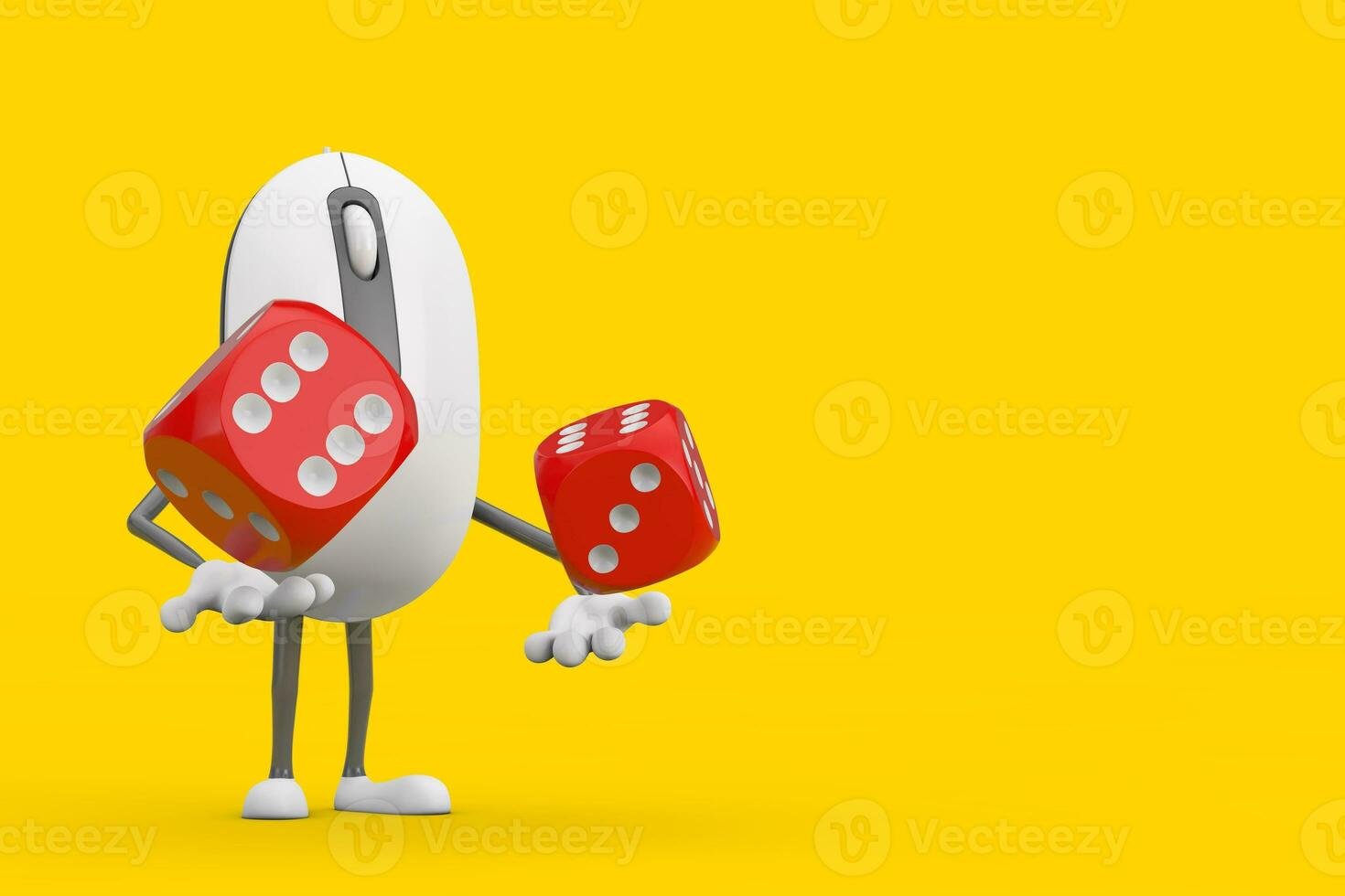 Computer Mouse Cartoon Person Character Mascot with Red Game Dice Cubes in Flight. 3d Rendering Pro Photo
