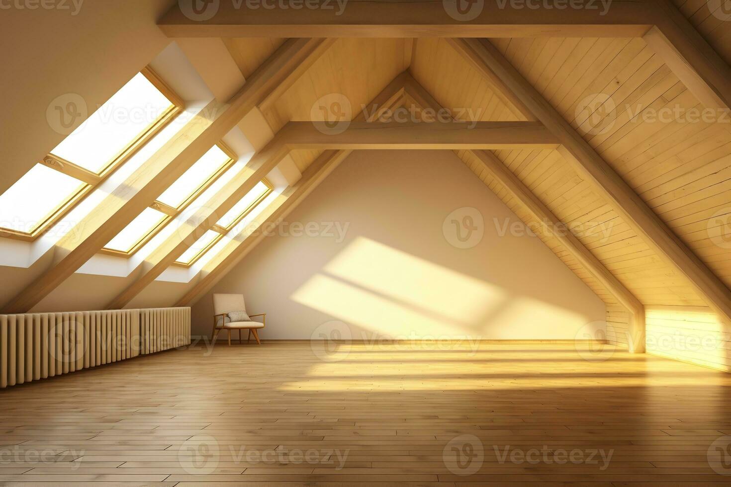 AI generated empty attic with wooden floor, single chair, and skylight, flooded with natural light. The room is spacious and bright, with a unique character created by the sloping ceiling Pro Photo