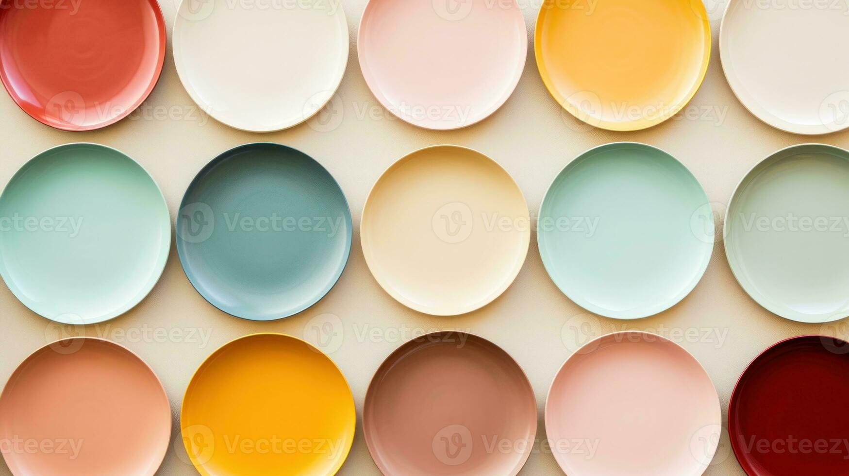 AI generated A vibrant display of plates in a line, each with a unique color and pattern. Generative AI Pro Photo