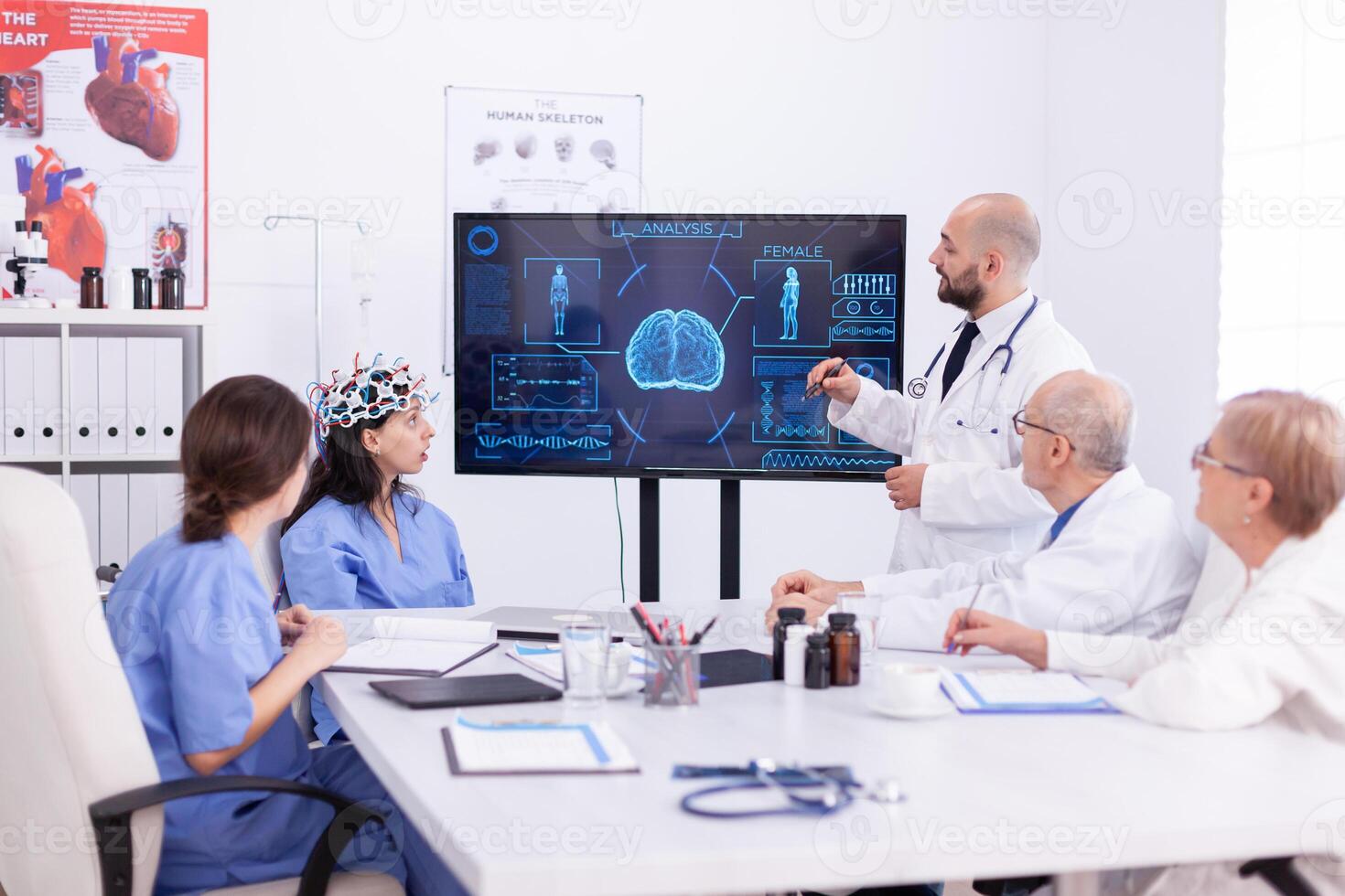 Nurse wearing headset with sensors during neuoroscience experiment in medical conference team. Monitor shows modern brain study while team of scientist adjusts the device. Pro Photo