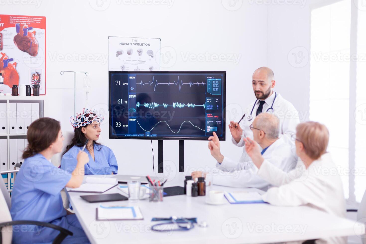 Doctor discussing about braing waves while is wearing headset with sensors. Monitor shows modern brain study while team of scientist adjusts the device. Pro Photo