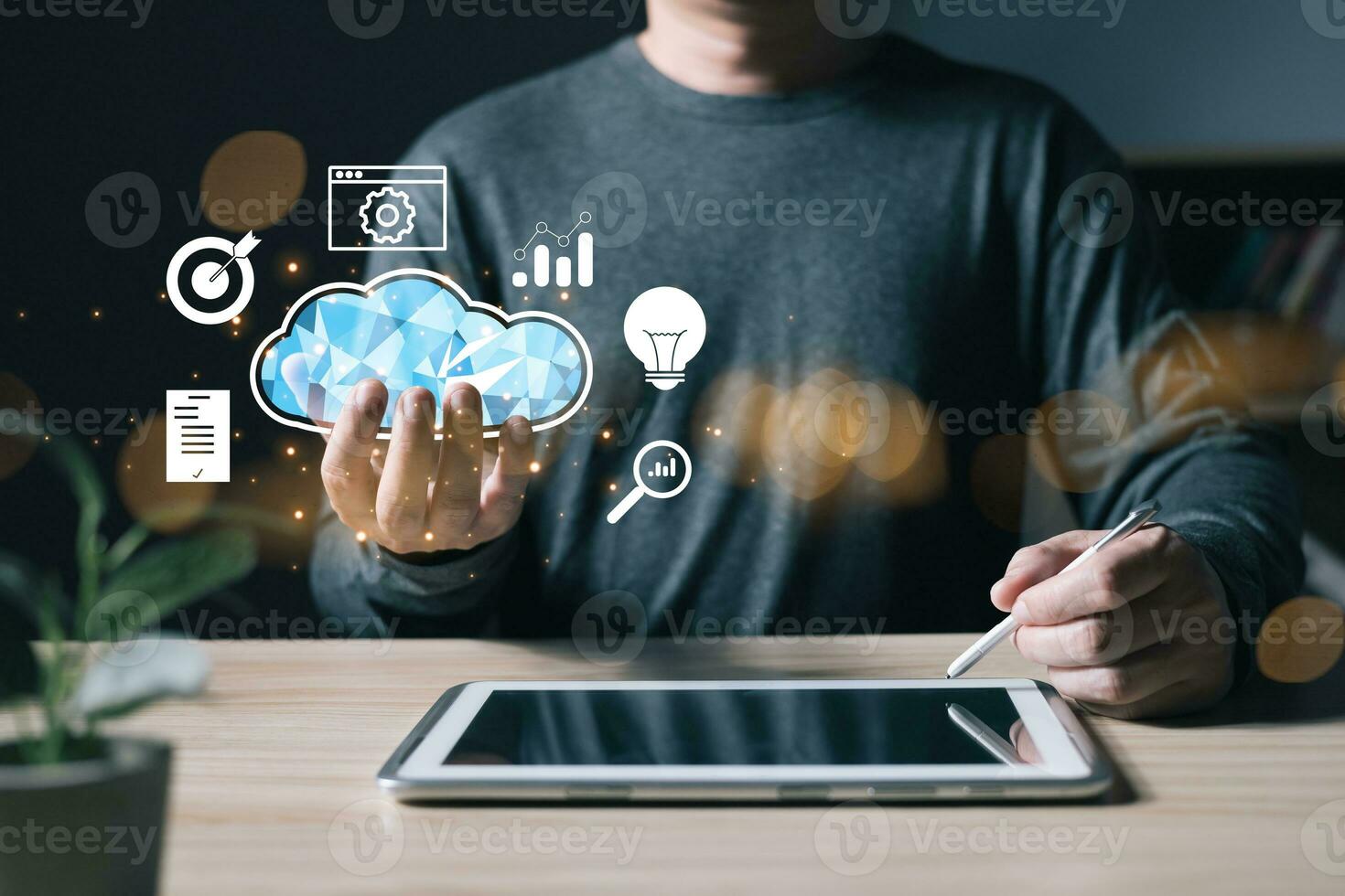 man hold cloud computing diagram show on hand,buying and selling commerce online digital marketplace.Data storage.the use of online digital network technology in business. Pro Photo