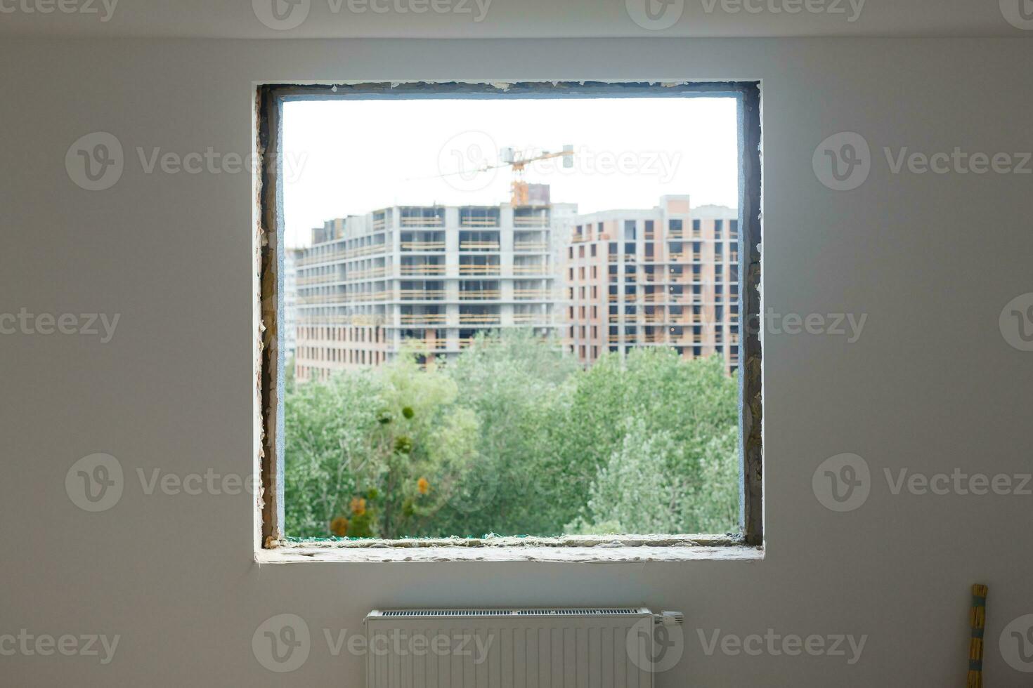 Empty frame on a wide panoramic window. Gorgeous view from the window of an apartment in a multi-storey building. Roofs of houses and trees from a height. Beautiful view through the window. Frame for Pro Photo