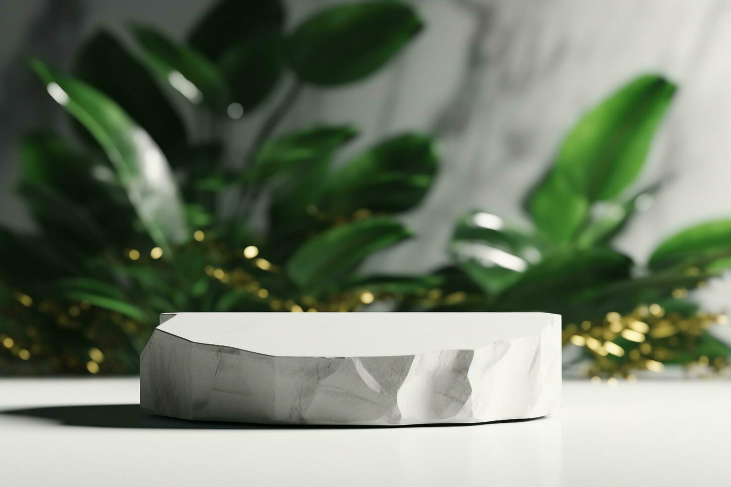 AI generated Stone product display podium with blurred nature leaves background. 3D rendering. generative ai. photo