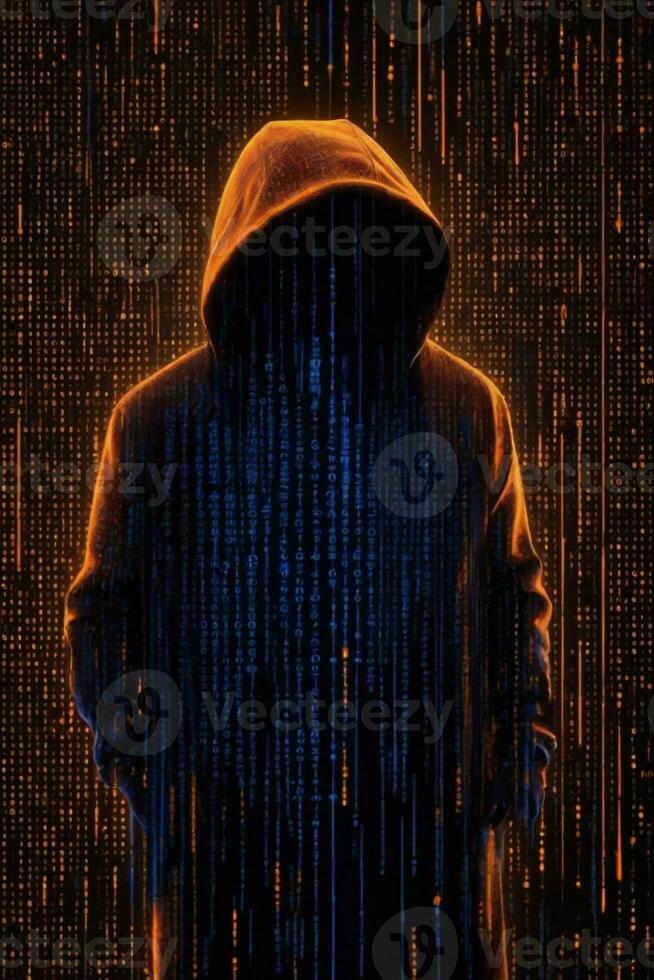 AI generated hacker in a hood on the background of a computer artificial intelligence matrix Pro Photo