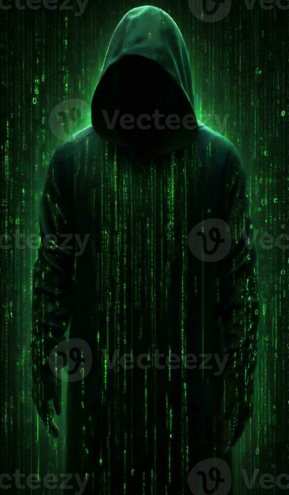 AI generated hacker in a hood on the background of a computer artificial intelligence matrix Pro Photo