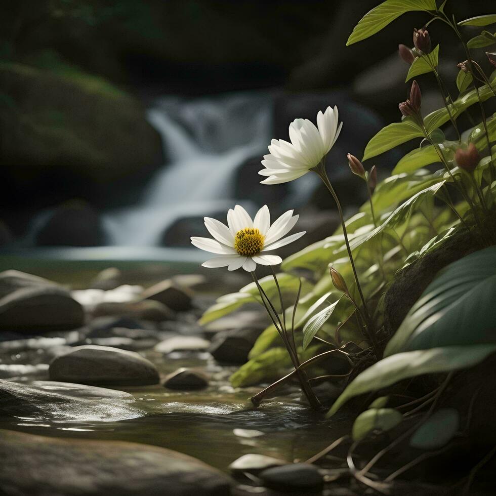 AI generated White daisies in a stream with a waterfall in the background. generative ai photo