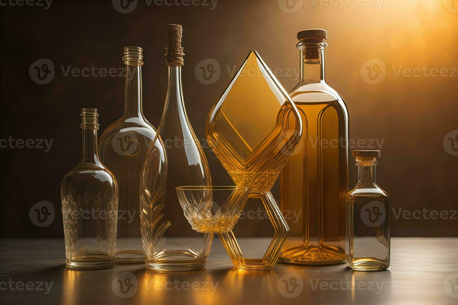 AI generated Composition with empty bottles and glasses on table. Alcohol drink concept. generative ai Pro Photo