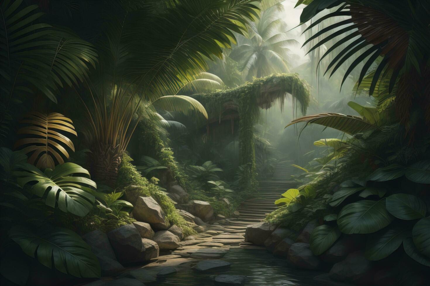 AI generated A pathway in tropical rainforest with palm trees and path in the mist. ai generative photo