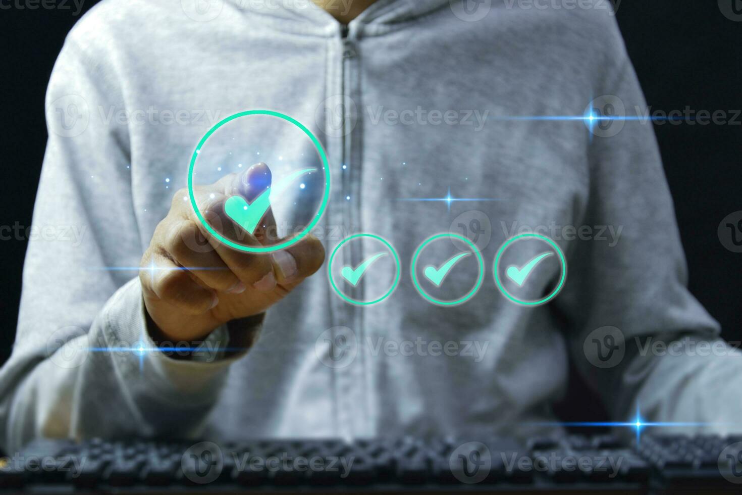 service guarantee, Validation concept for business process automation, quality assurance management, certification, digital transformation. businessman touching checked icon on virtual screen. Pro Photo