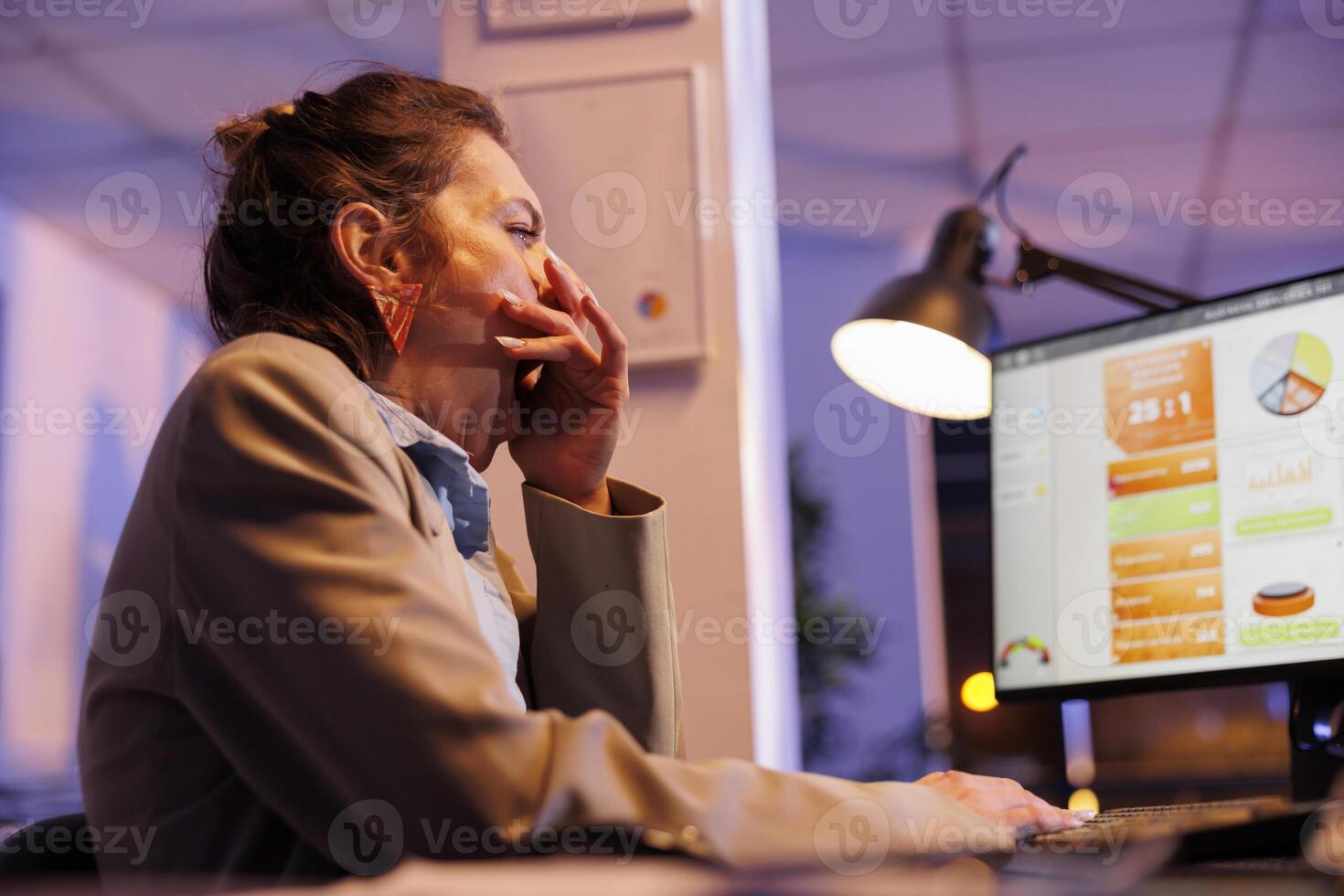Exhausted manager yawning while analyzing financial graphs report on computer, working overhours at comany investment strategy in startup office. Tired sleepy entrepreneur typing profit progress Pro Photo