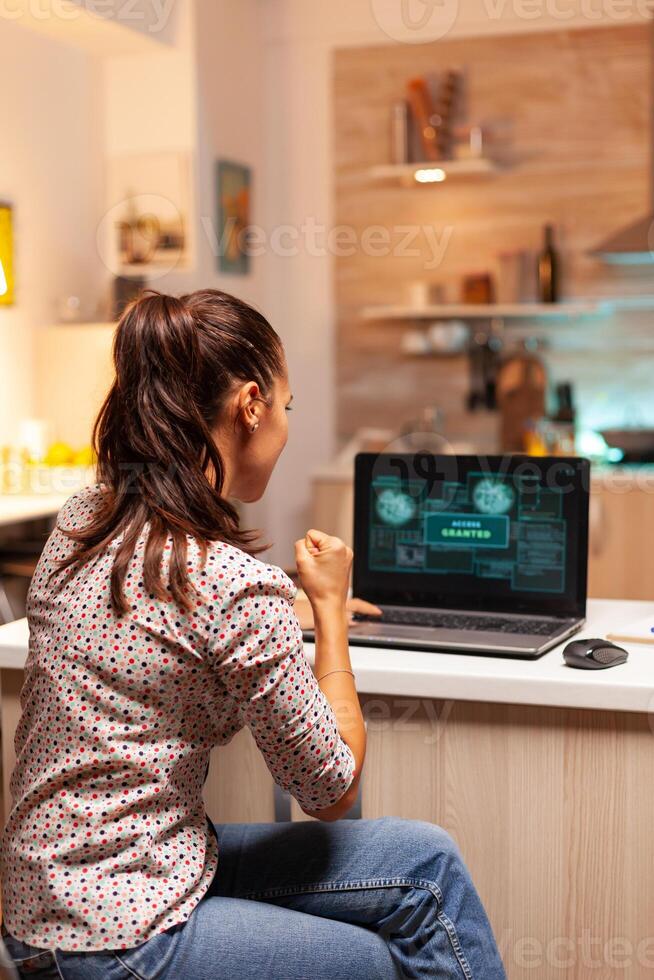 Happy woman hacker after cracking firewall of government and getting access granted. Programmer writing a dangerous malware for cyber attacks using performance laptop during midnight. Pro Photo