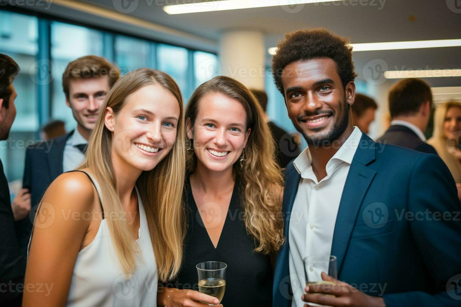 AI generated business teamwork smiling in the office bokeh style background with Generated AI Pro Photo