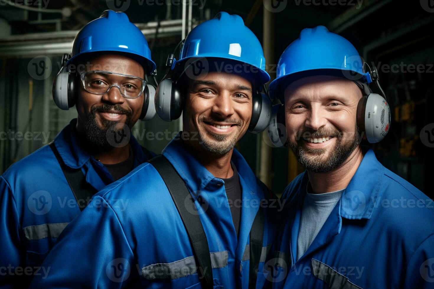 AI generated three maintenance engineer wearing blue uniform smiling bokeh style background with Generated AI Pro Photo