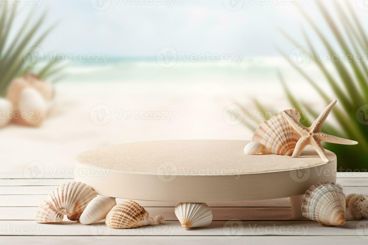 AI generated Empty Round Beige Platform Podium with Sea Shells and Starfish on White Beach Sand Background. Generative AI Pro Photo