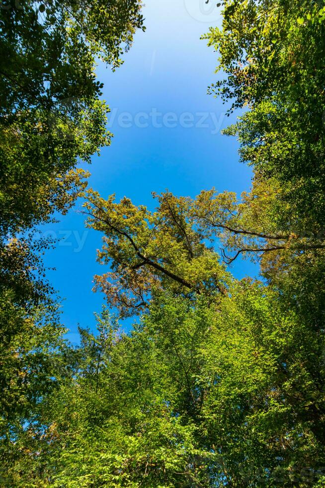 Trees and clear sky. Forest view from below. Carbon net zero vertical photo Pro Photo