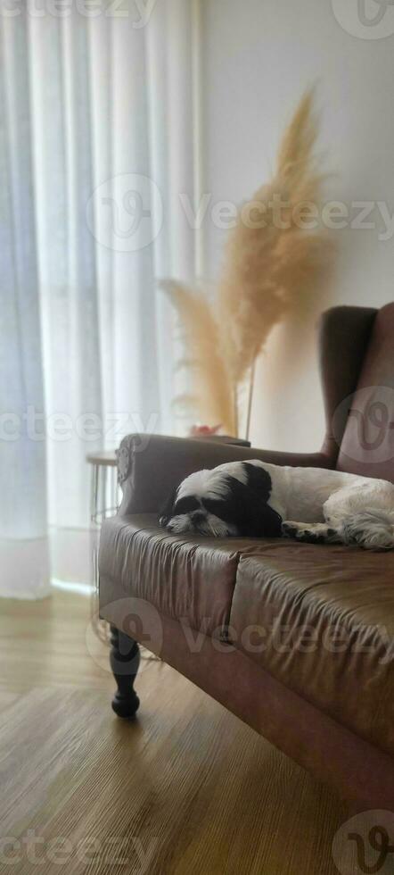 Doggy Affection in Luxurious Home Purchase this charming image of a puppy relaxing on a leather sofa, adding warmth and style to your projects Pro Photo