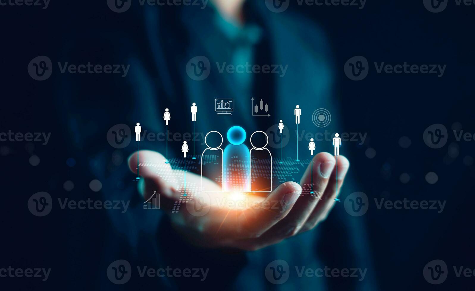 Customer Relationship Management, CRM, Businessman or client show global structure customer network technology, Data exchanges development, Customer service, Digital marketing online, Social media, HR Pro Photo