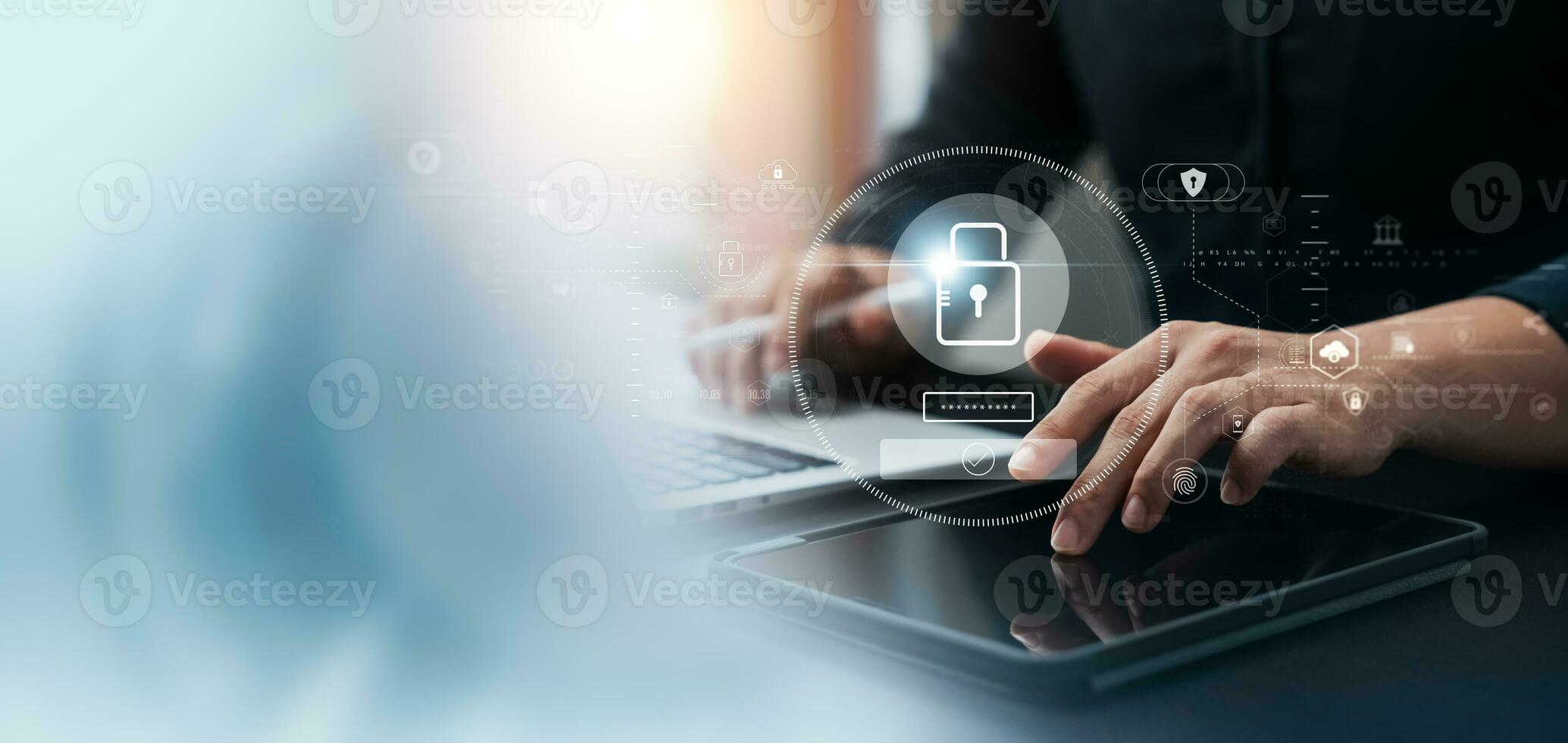 Cyber security and data protection, businessman using laptop internet network security, protect business and financial transaction data from cyber attack, user private data security encryption. Pro Photo