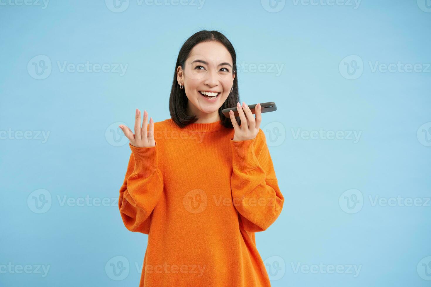 Cheerful smiling korean woman talk on speakerphone, records voice message, learns how to speak using language learning mobile app, blue background Pro Photo