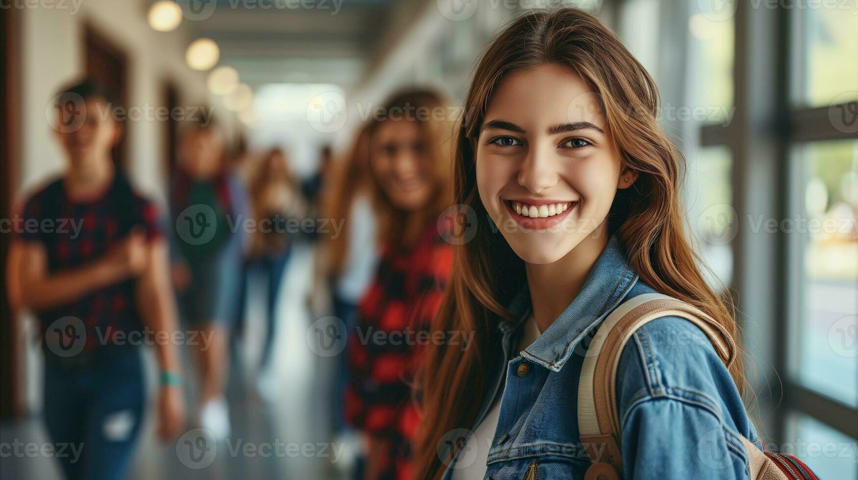 AI generated Smiling young girl in corridor with class. Generative AI Pro Photo