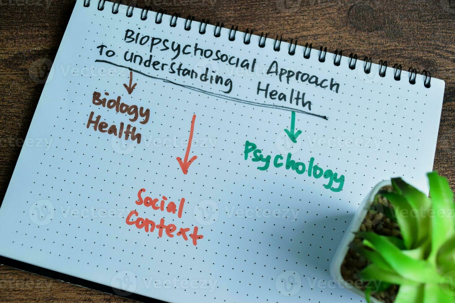 Concept of Biopsychosocial Approach to Understanding Health write on book with keywords isolated on Wooden Table. Pro Photo