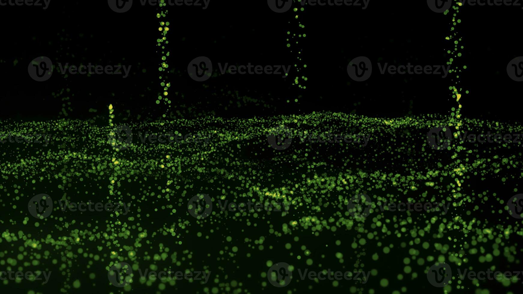 Abstract green shiny futuristic digital space with unique dots and flying comets. Motion. Dark green wavy surface of tiny particles. Pro Photo