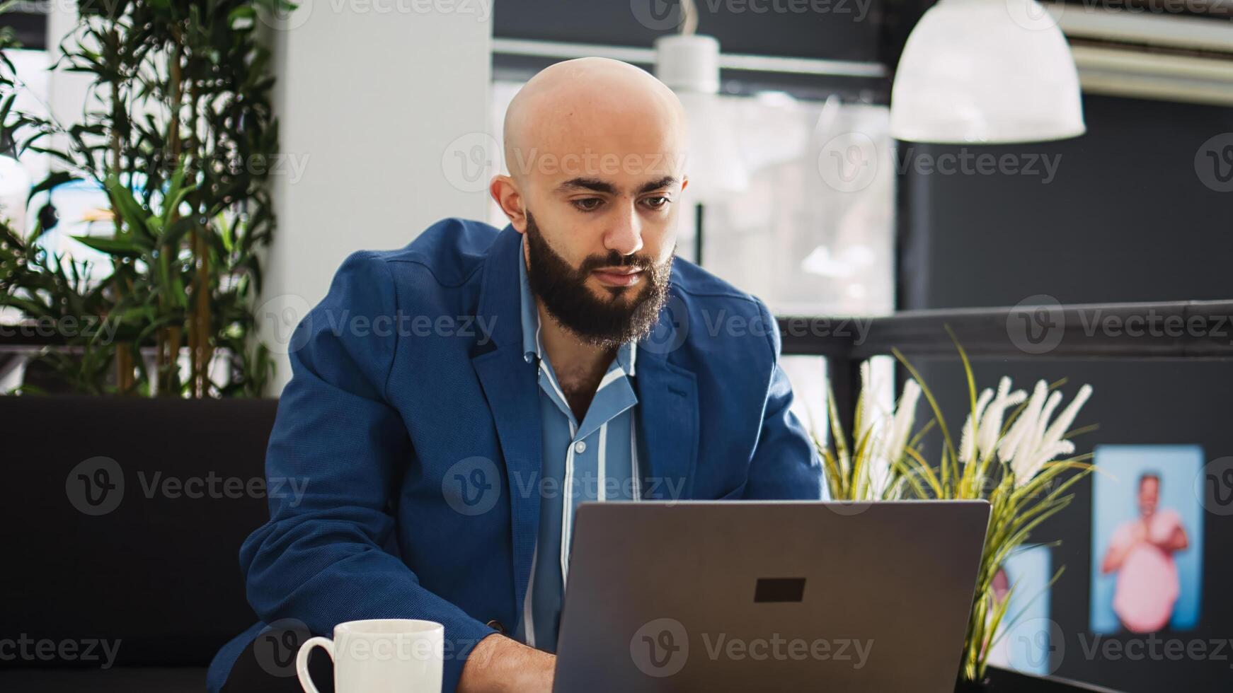 Manager comparing data on laptop and working in startup coworking space. Small business employee standing near workstation, analyzing statistics report for programming. Agency CEO. Pro Photo