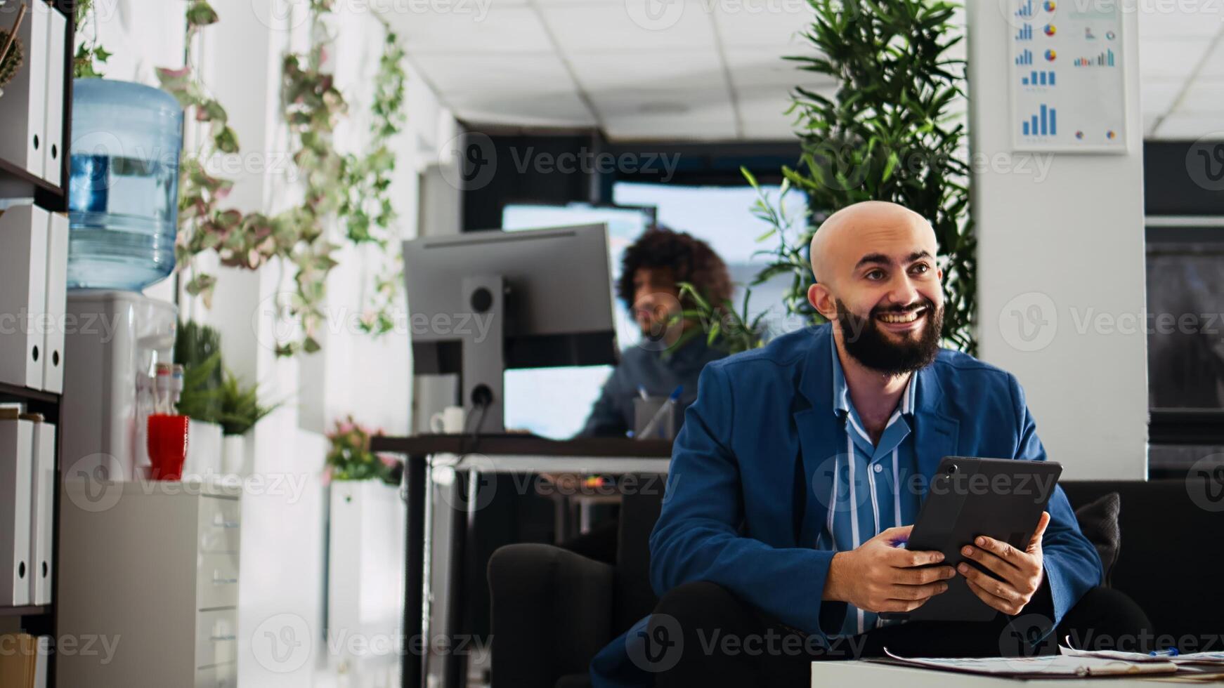 Employee comparing data on tablet while working in open space office. Unicorn business worker reviewing documents and annual statistics on device, trying to solve executive tasks. Pro Photo