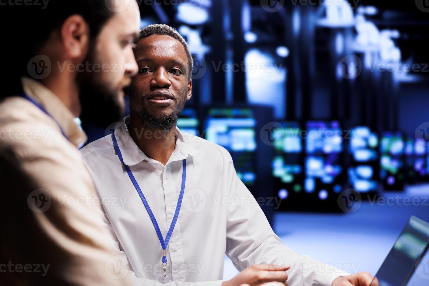Teamworking IT developers dealing with server hub system failures. Programmers brainstorming ideas on how to best minimize high tech data center downtime and prevent crashes Pro Photo