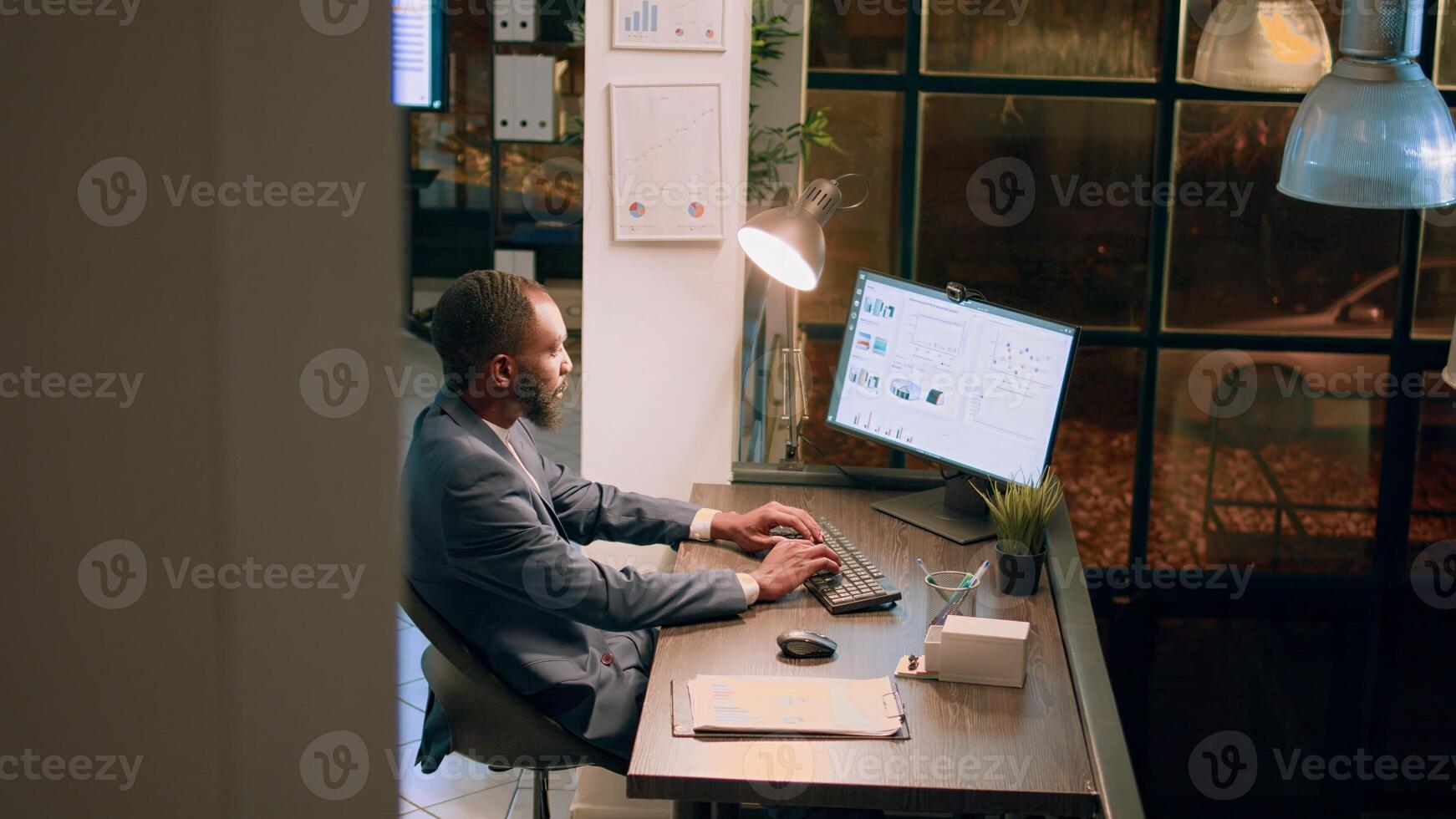 Proficient accountant sitting at desk, looking over statistics charts, imputing data on computer during nightshift with colleague working in background. Company staff personnel solving task at work Pro Photo