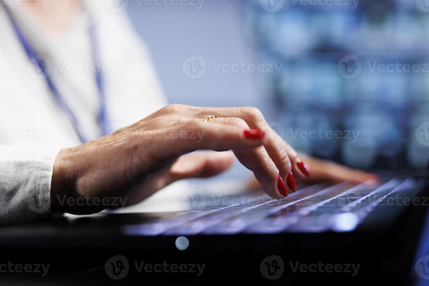 Skillful professional using laptop to make sure valuable data remains shielded from security complications, safeguarding high tech place against unauthorized access and vulnerabilities, close up Pro Photo