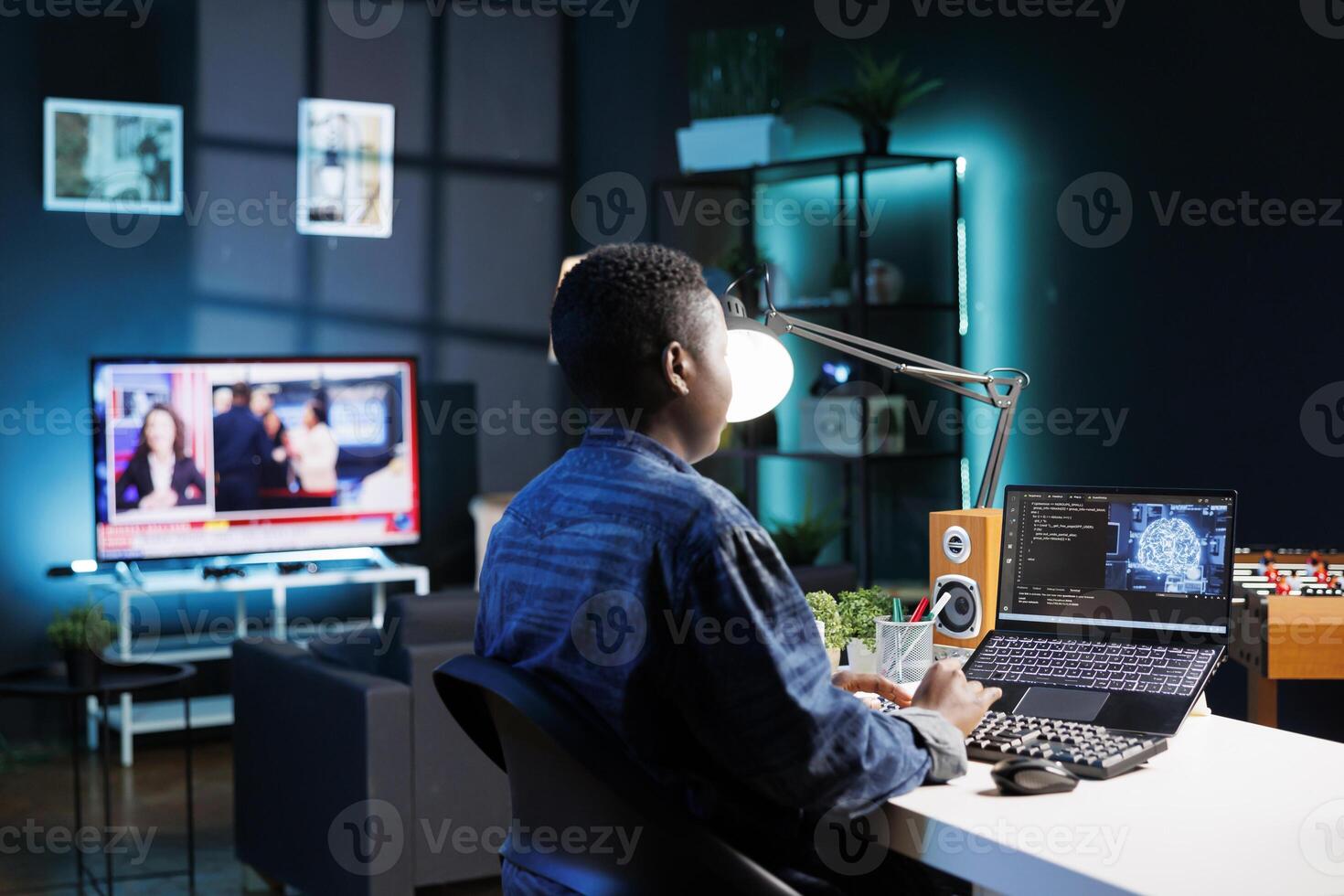 Black woman working on laptop managing code and programming in artificial intelligence and machine learning. African american female freelancer using personal computer to ensure cyber security. Pro Photo