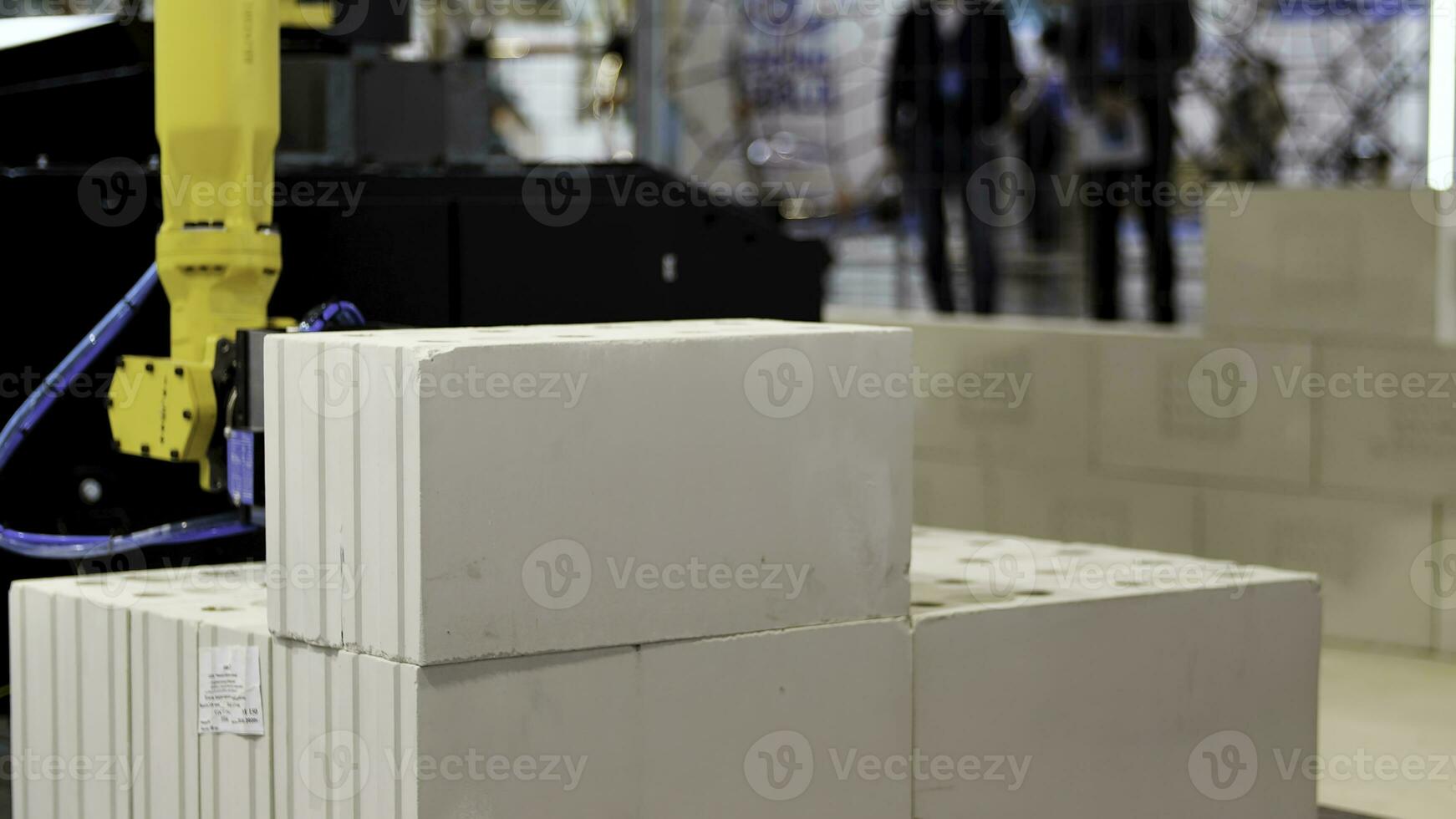 Automatic bricklayer robot working for building a wall. Media. Close up of automated machine presented at the robotic exhibition of technologies in construction industry. Pro Photo